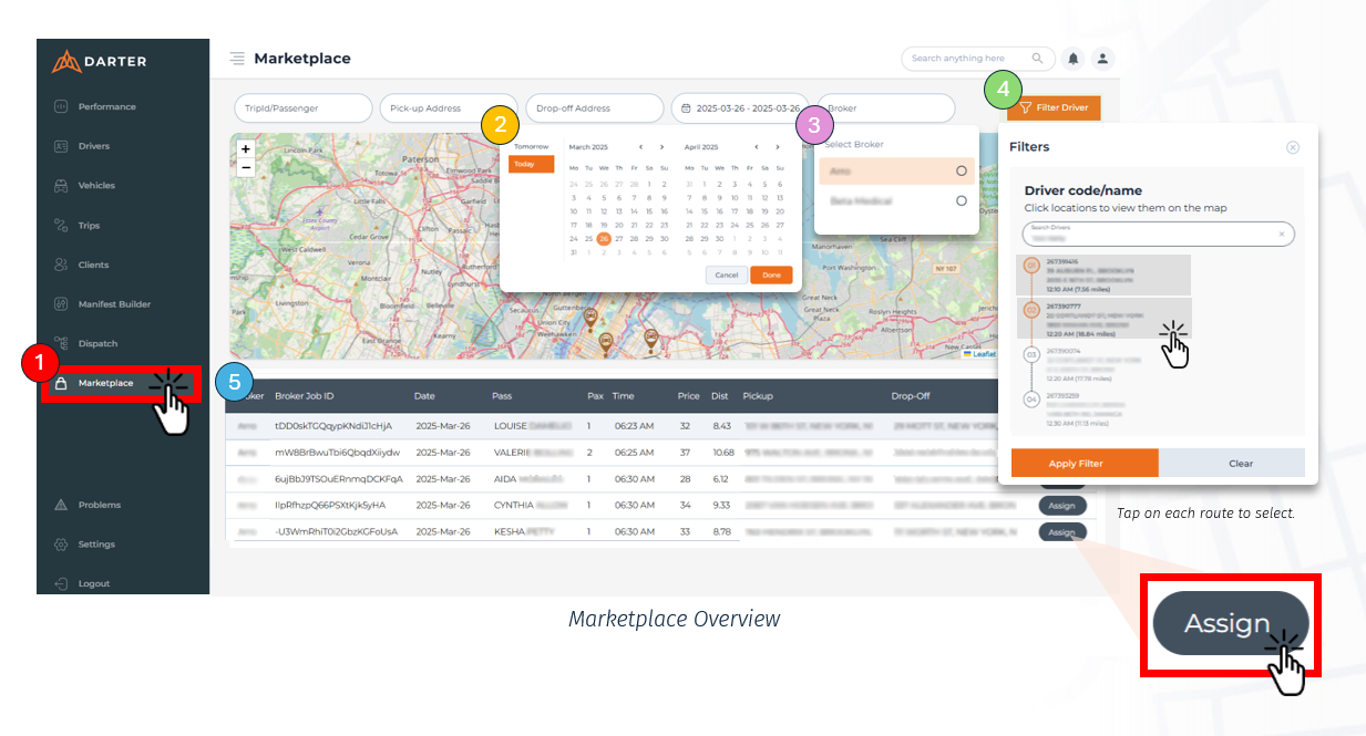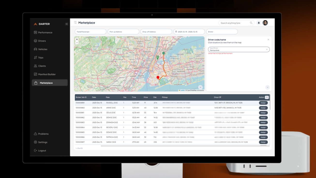 A unified marketplace to view, share, and claim trips with ease. Rich advanced filters help match routes, timing, and service types for optimal pairing.